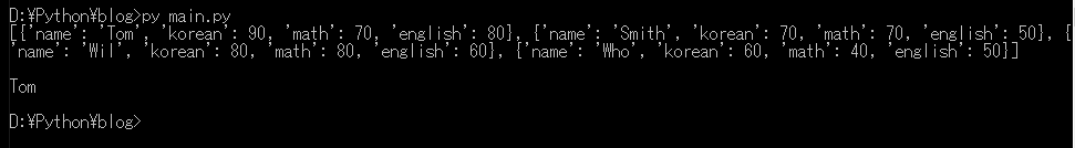 data = [{'name':'Tom','korean':90,'math':70,'english':80},